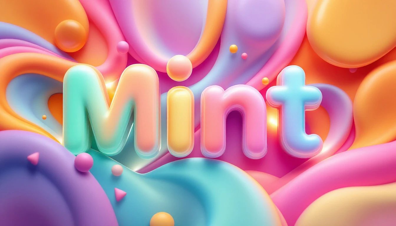 Abstract art showcasing the word 'Mint' in a minimalist style. Each letter is uniquely colored in a vibrant palette, with colors distinctly different for each letter. The letters are 3D smoothly chubby rounded, embossed, and dynamically animated. The animation includes slow spinning and popping movements, with a glowing lighting background that enhances the design's aesthetic appeal