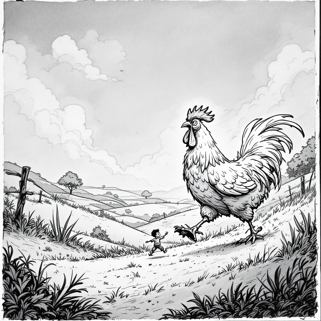 FLUX prompt: black and white pencil sketch of a big rooster cha...
