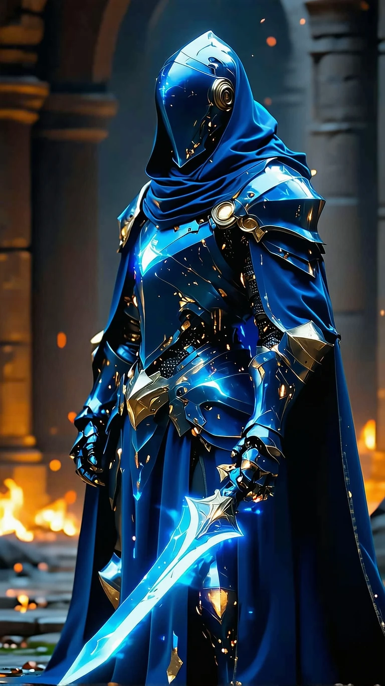 medieval knight cybernetic mage with cool robes and glowing weapon, sci-fi, photorealistic, cinematic,