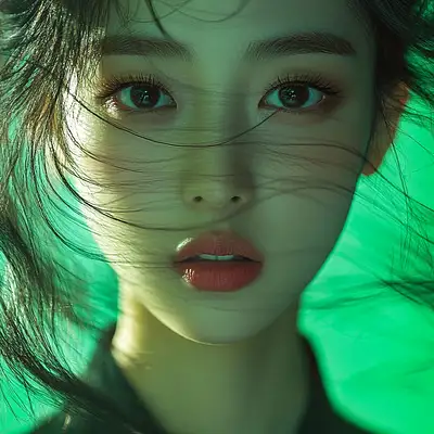 A beautiful Japanese woman with long eyelashes, green hair, face covered with water droplets, high fashion magazine cover, minimalism, symmetrical composition, white background, wide aperture lens, soft light, studio photography, high resolution, very detailed skin texture, shot using high-end photography equipment