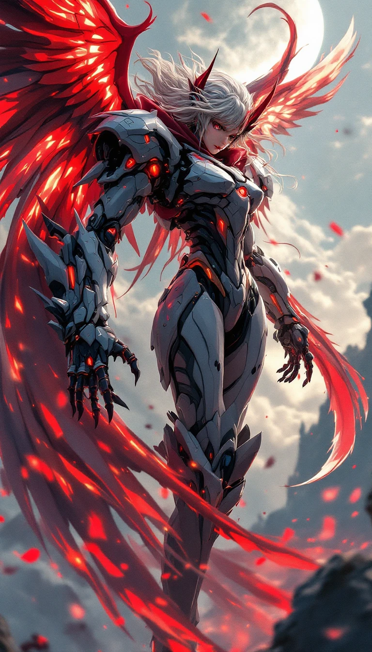 {{Makoto Shinkai styled anime} }, adult woman, transforming into Evangelion Demonic Demon inspired mecha, fly me to the moon, {{beautiful intricate triadic antique white colour hair} }, beautiful eyes, evil and cute, Burgundy red hoodie, mega robotic angel and devil wing, beautiful leg, full body, rich in details, luminism, masterpiece, three dimensional effect, 3d render, octane render, {{mix of bold dark lines and loose lines} }, Isometric, awesome full color, {{ultra detailed face} }, {{rule of third} }, 8k resolution, neon lighting