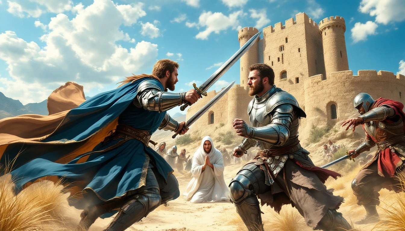 a medieval battle scene with a wide-angle perspective, showcasing a dramatic clash between armored warriors in a desert landscape. The central figure, a brunette man, wears a blue tunic and wields a sword in each hand. He faces a silver-armored opponent with a flowing cape. A kneeling figure in white prays behind the brunette man, while another man in red and brown armor charges forward. A stone castle with a tower stands in the background, set against a blue sky with white clouds. The desert landscape features dry, yellow grass and mountains in the distance. The image's style suggests a digital illustration or painting, with a focus on capturing the intensity of the battle scene.