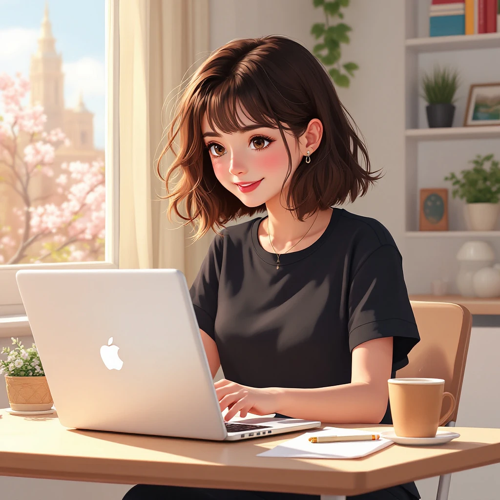 1girl, happy, very closeup painting, short feathered hair, best brown girl hair, pretty woman typing on a laptop, laptop, desk, chair, laptop on desk, coffee, apartment, spring, indoors, windows, other parts of home, clear sky, cute, black t-shirt, black pants, aesthetic. (best quality:1. 2) , animated lighting, octane render, bright mood, fashion, trending, detailed fanart, realism.