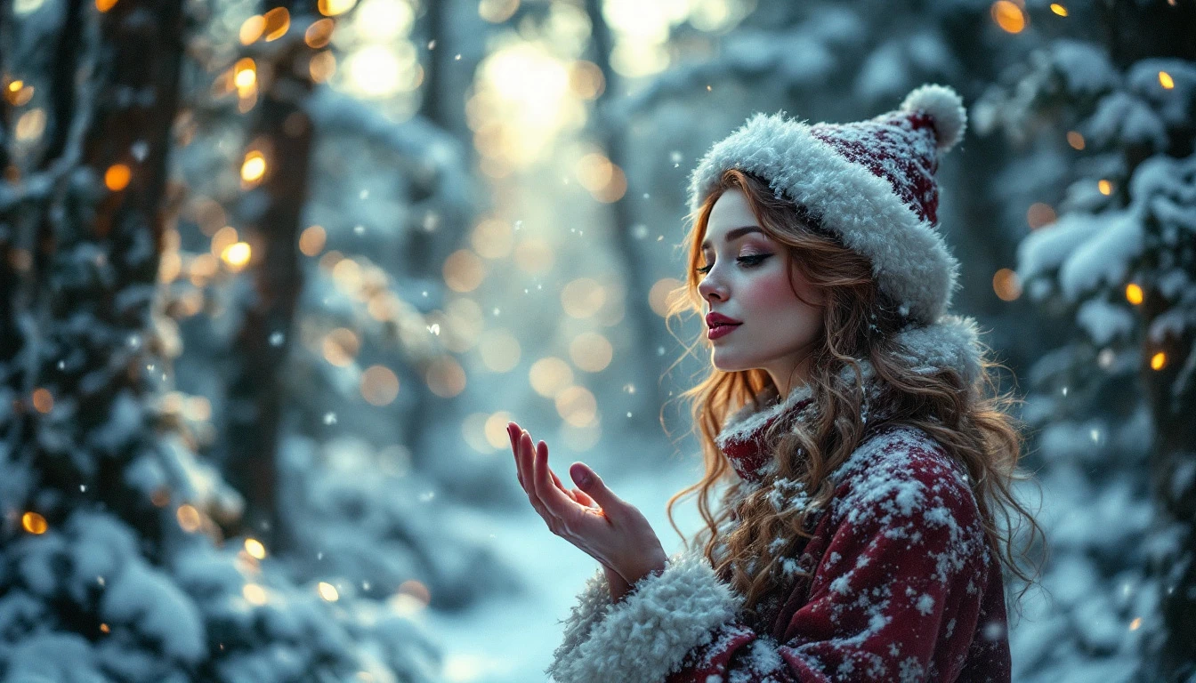 Scène cinématographique. Forêt d'hiver recouverte de neige. jolie personnage de madame Noël regard doux, rousse cheveux long ébouriffée, dansante, étincelles dans les mains levées , la neige tombe doucement, scène de noël joyeuse, lumière dans les arbres , jolie bokeh