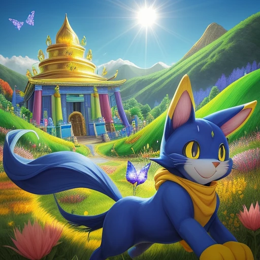 photograph of Klonoa in the vibrant Wind Valley, , with his long ears and blue cap, joyfully runs through the green hills, holding his golden ring ready to use the power of the Wind Bullets. In the background, the majestic Sun Temple shines under the sunlight, surrounded by colorful creatures and shimmering butterflies. The setting is full of life and mystery, with Klonoa always ready to face enemies and solve puzzles on his adventure.