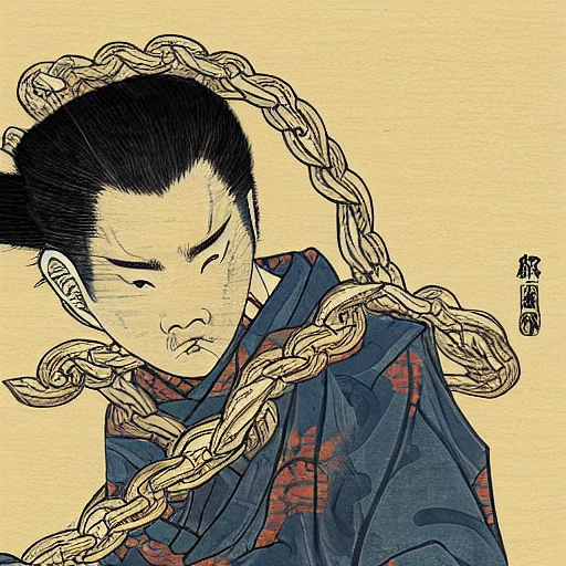 greeting card by hokusai, samurai man vagabond with a moon behind him, the samurai is wrapped in chains, detailed, editorial illustration, matte print, concept art, ink style, sketch, digital 2 d