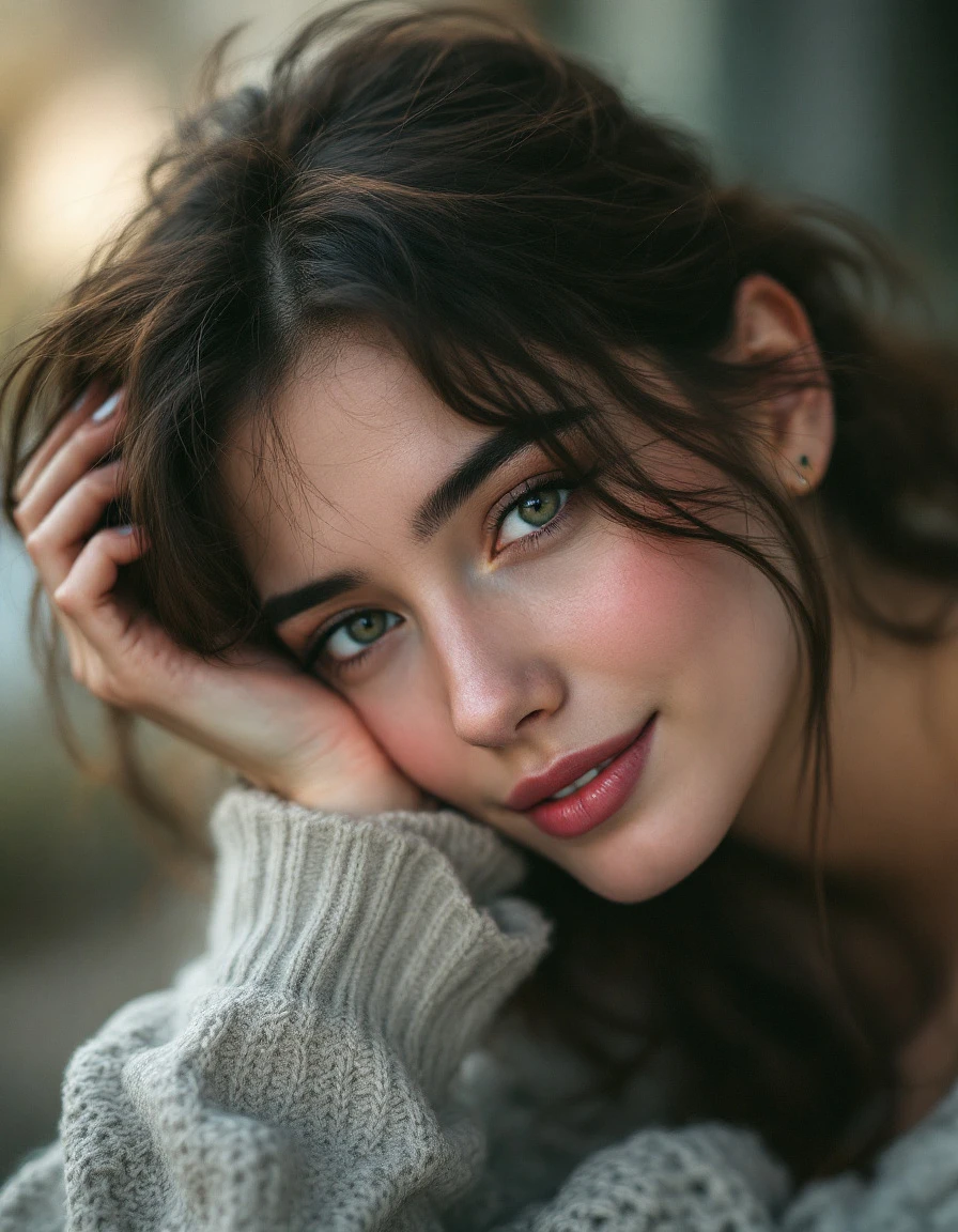 cinematic photo Extreme close-up, photograph of, a woman with messy brunette hair is leaning on her head on her hand, no makeup, happy, smiling, outdoors, masterpiece, UHD, natural light, realistic . 35mm photograph, film, bokeh, professional, 4k, highly detailed
