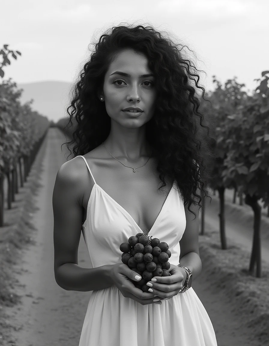 photographer Michelle Perez, Sicily, black and white photography, high contrast, 60s style, italian fashion model of the 60s, young sicilian woman 18 years old, large facial features, carefree expression, long black curly hair, in a light white open short dress, with a deep neckline, against the background of a vineyard, tenderly holding a bunch of grapes in her hands
