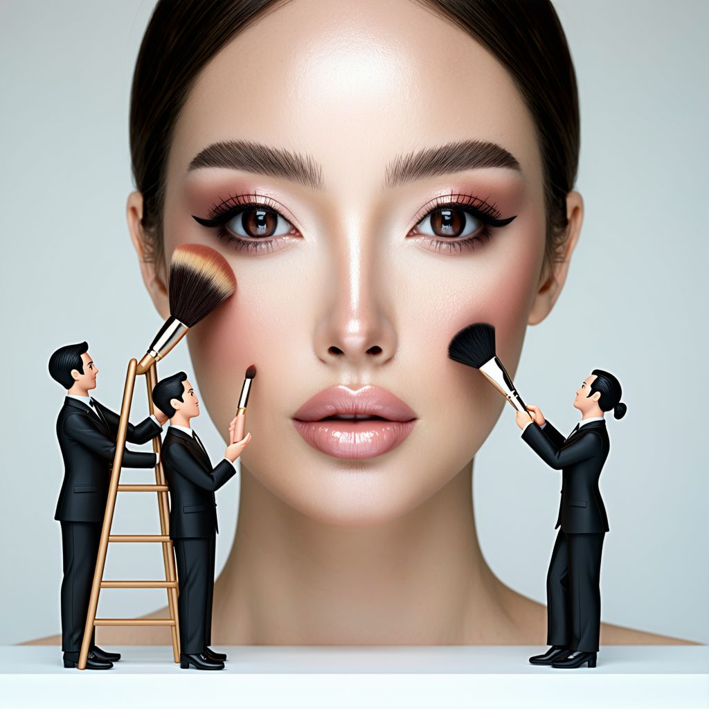 A stunning model with naturally glowing skin, her face appearing as a giant canvas. Tiny people, dressed as professional makeup artists, are carefully applying makeup—one using a giant brush for blush, another climbing a ladder to blend eyeshadow, and a third carefully painting her lips with a roller. The scene is illuminated with soft, cinematic lighting, capturing the elegance and luxury of a high-end beauty campaign.