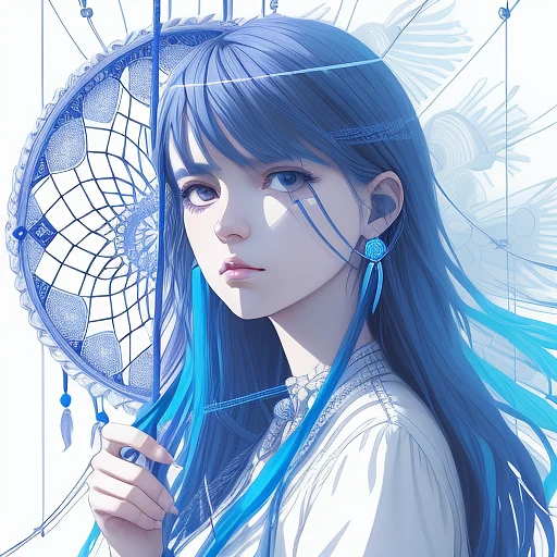 Woman Dream Catcher, in the style of crisp neo-pop illustrations, sky-blue, nightcore, trompe-l'œil illusionistic detail, detailed penciling, pensive portraiture, ar 35:64 --stylize 750 --v 6
