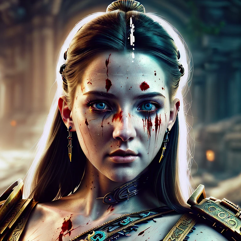 portrait of a A stunning beautiful ethereal white female warrior steampunk, very detailed, rendered in octane, vivid bright, atmospheric, vivid epic, dramatic, 8k, unreal engine, photorealistic, hyperornate detail“ by jim lee, julia bell, sharp focus, ultra photo realistic, blood splatter