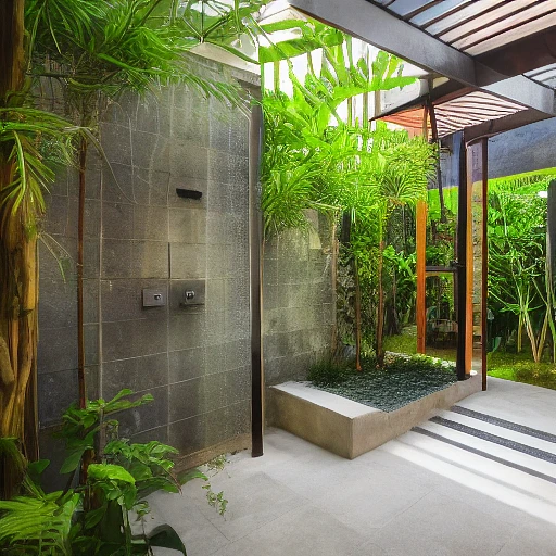 High resolution photography of modern enclosed lush balinese garden courtyard with outdoor shower small spa and dining area with smooth paving, magazine, cozy atmosphere; 8k, intricate detail, photorealistic, realistic light, wide angle, kinkfolk photography, A+D architecture