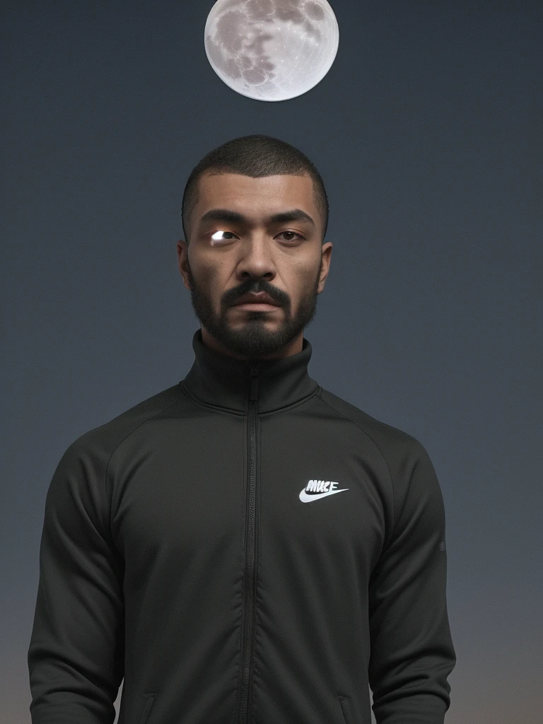 man with 🗿head using nike tracksuit, night time, big full moon in the background, ultra realistic, shoot with Sony Alpha a7R IV FE 70-200mm f/2. 8 GM OSS lens ISO 100, 8k, high definition, matte painting –w 2176 –h 3840 –iw 1 -v 5 --s 1000 --ar 7:4 --raw