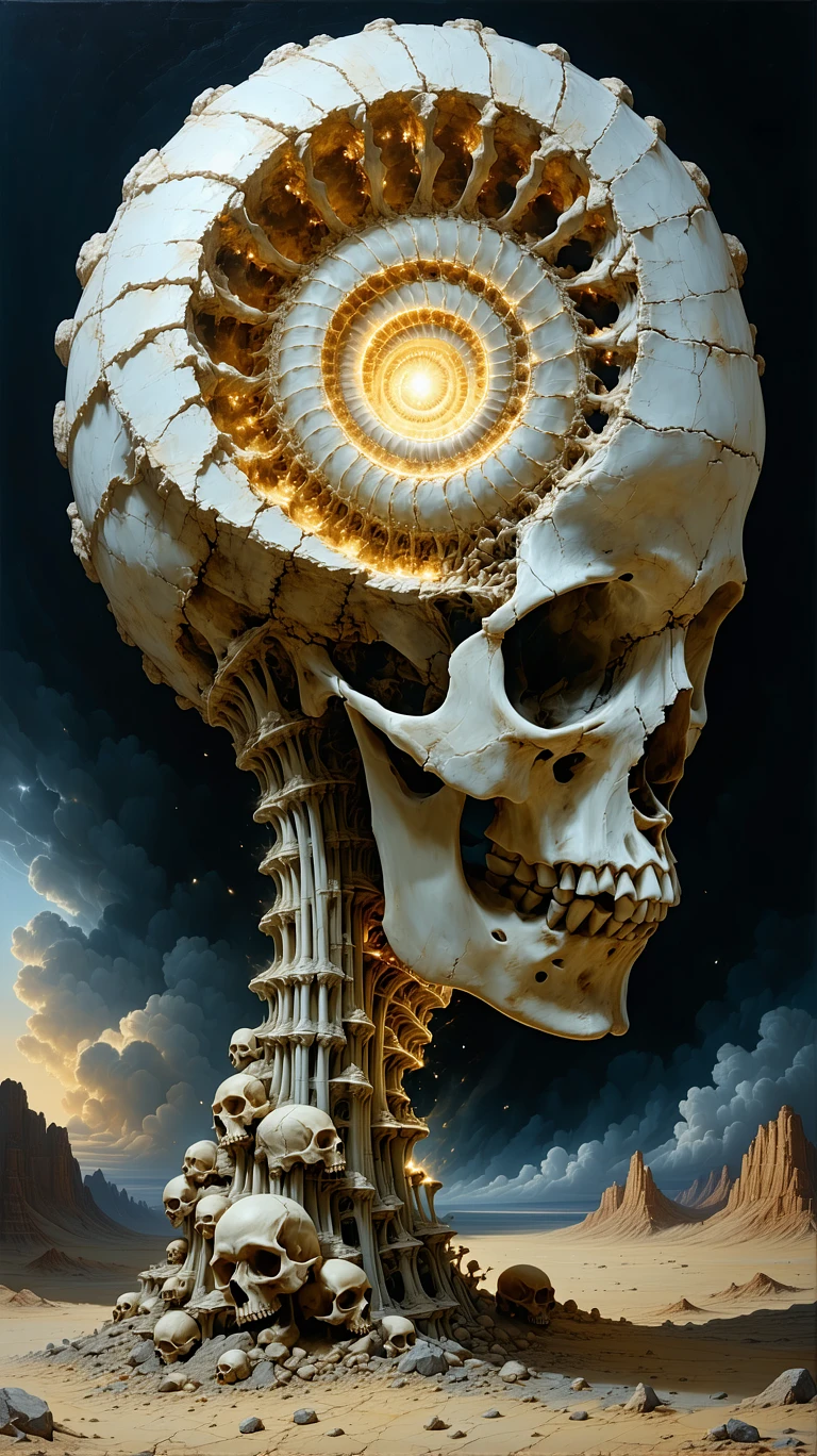 A massive, surreal skull spiral made entirely of human skulls and bones, forming a nautilus shell shape with intricate bone textures, glowing golden center emitting radiant light, set on a barren desert under a moody, cloudy sky. Add an overlay of heavy grunge texture, with worn edges, subtle scratches, and gritty details for a dark, haunting atmosphere. Highly detailed, hyperrealistic, dramatic lighting, art by Zdislav Beksinski and HR Giger, cinematic composition.