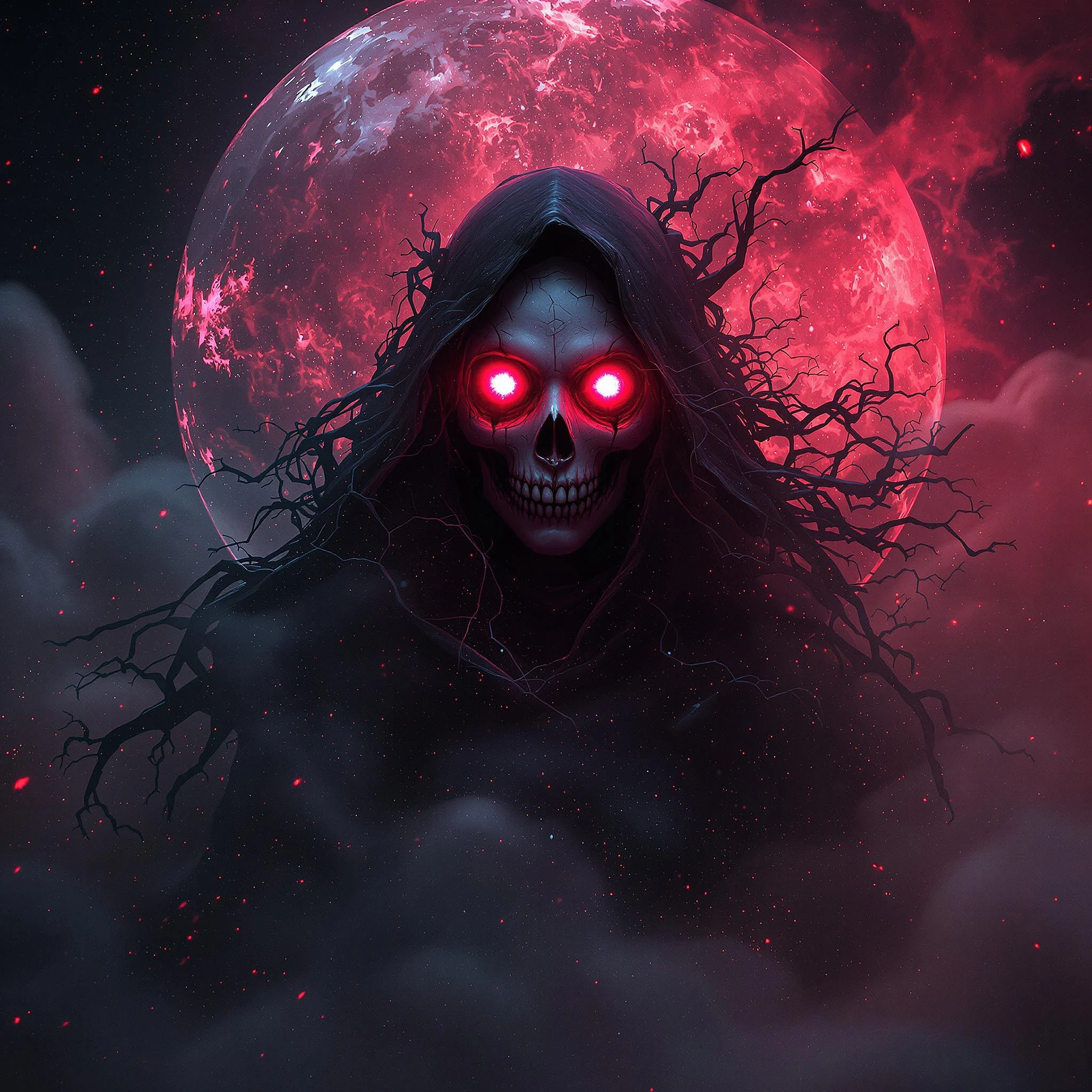 grim reaper from space, Darkwave, synthwave, epic music album cover. glowing dead eyes of a woman, retro movie poster art, dust, dramatic lighting, artstation, 9k Red Lights , alberto seveso art, sillhouette, water ink, ink water, ink cloud, alberto seveso art, loose, intricate detail, beautiful woman, cinematic lighting, octane render, 8k render, volumetric lighting