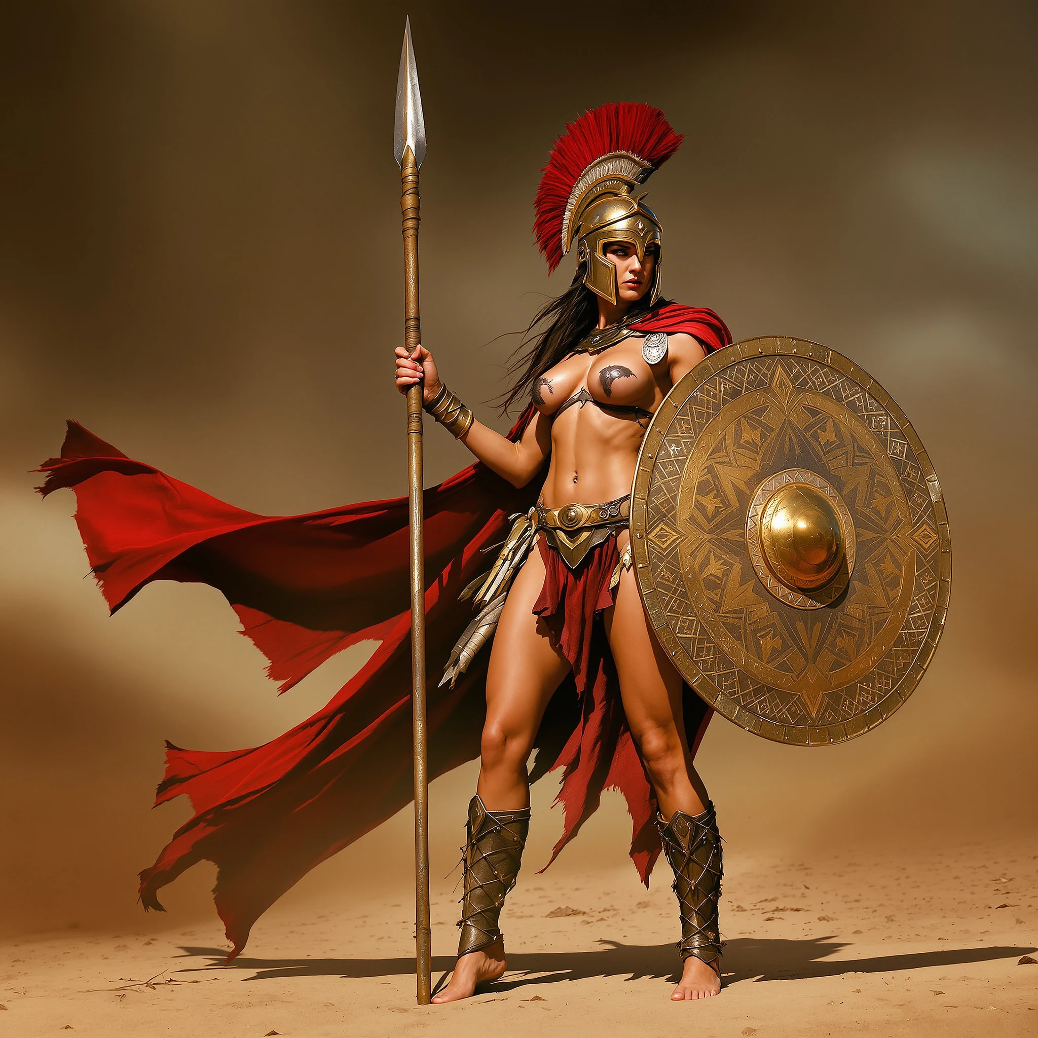 full body view of a female warrior spartan like film 300, spear helmet with plume, long red cape, big spear, big circular shield, leather bikini, no leggings, barelegs, barefoot, large battle background in desert setting
