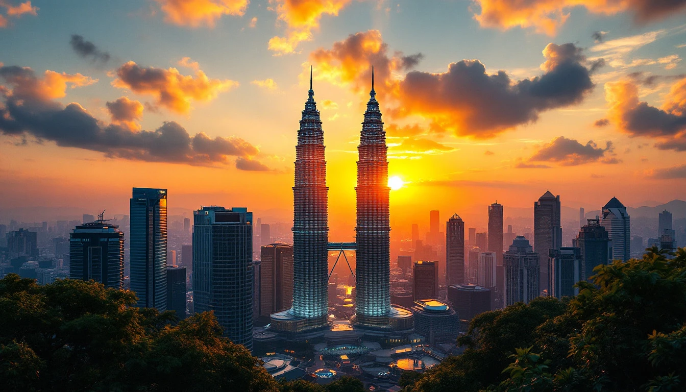 a beautiful photo of Kuala Lumpur city, showcasing the Twin Towers Petronas, taken from a distance, early sunset, canon, detailed photography, cinematic, large format IMAX, Kodak --ar 16:9 --style raw --v 6. 0
