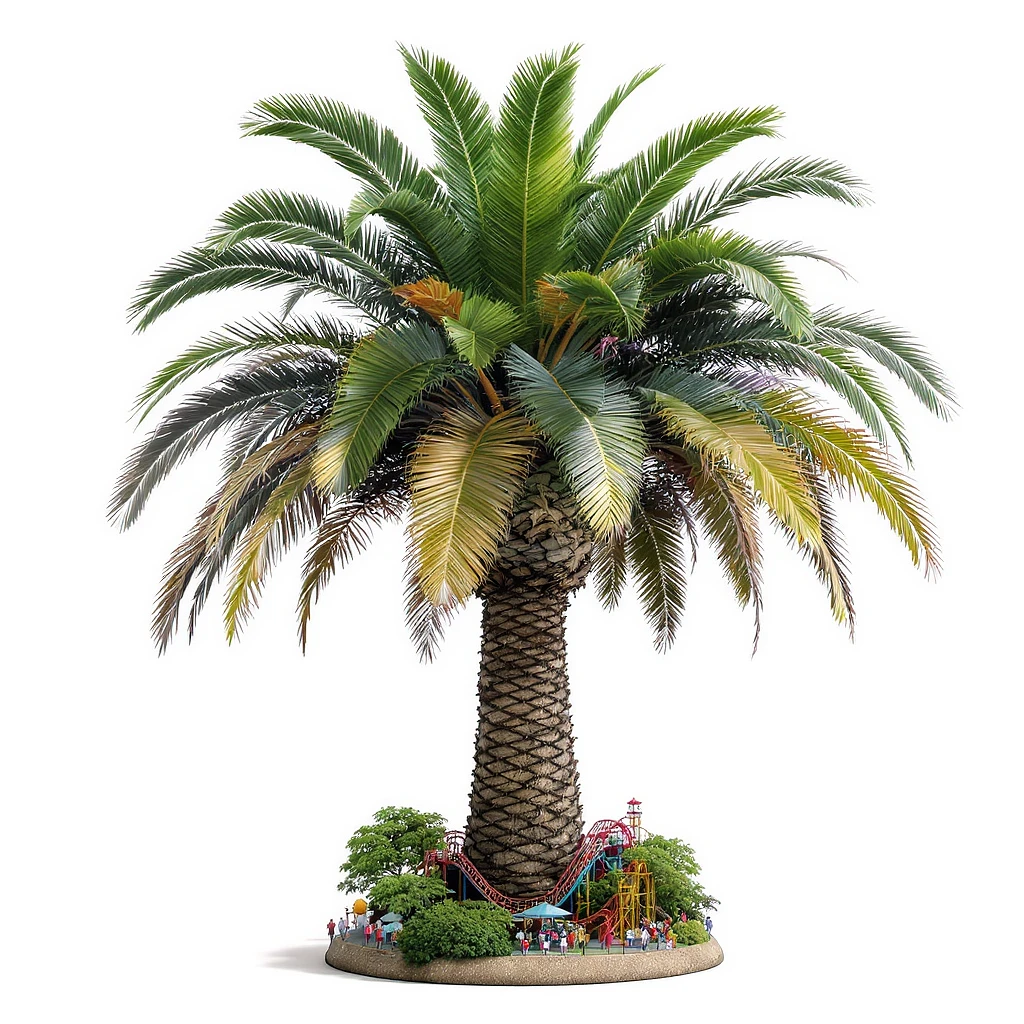African American palm and I side of their palm we see a miniature theme park Great America full of people visiting. The image is isolated on a white background
