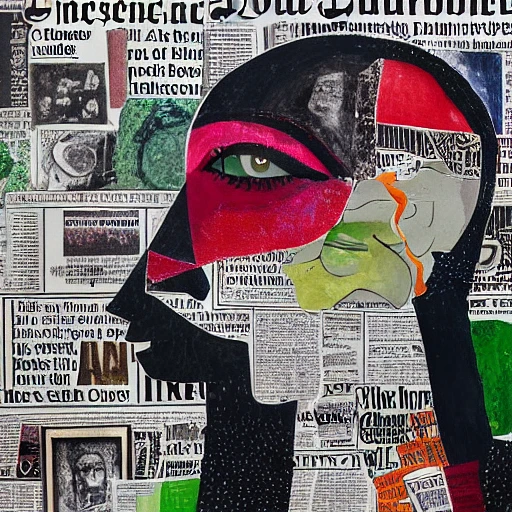 expressive gouache and ink illustration, editorial illustration! content for political opinion article, new york times illustration, cluttered maximalist, rauchenburg, impasto paint, 3d elements, dark tones, editorial illustration award! ! contrast between large photocopy of face close up and other collage pieces with ripped headlines from newspapers