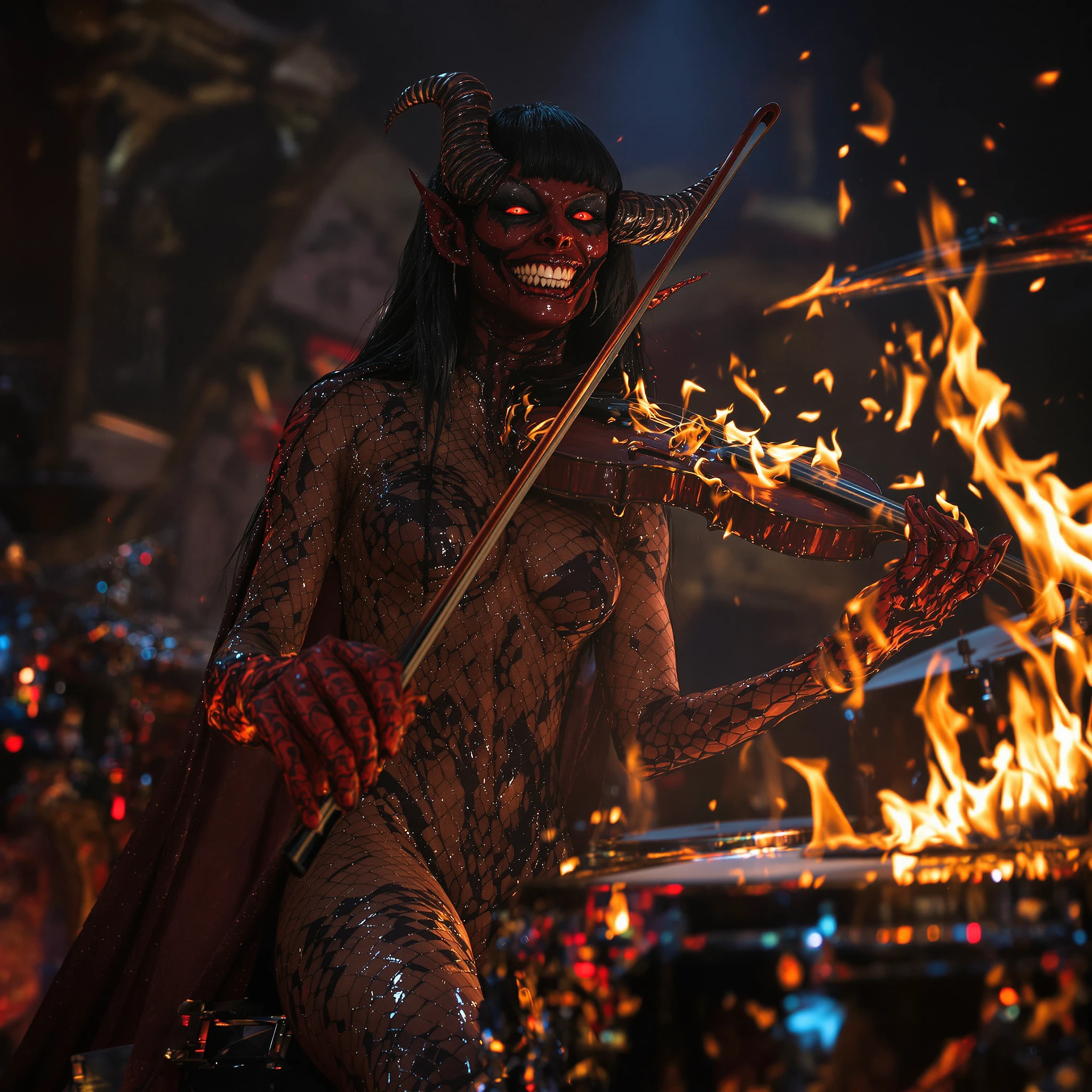 A centered shot focusing on the demonic musician's smiling face (showing her perfekt normal teeth) on the violin fingerboard, reminiscent of Beksiński's dark mysticism A hyper-realistic, cinematic photo of a female demon character, reminiscent of the dark, mystical works of Zdzisław Beksiński, H. R. Giger, and Ashley Wood, with a Kodak Ektar lens-inspired aesthetic, featuring warm, golden tones and subtle lens flare. Her body is adorned with intricate, Rawish Shiny Black snakeskin pattern latex swimsuit, accentuating her toned, athletic physique, while her long, black hair flows down her back like a waterfall of night, styled with sharp, choppy bangs framing her heart-shaped face. Large, curved horns protrude from her forehead. Playing a burning Tama drumset. The atmosphere is electric, with ambient blue and red lighting effects, creating an ethereal and radiant glow, as if the gods themselves have descended upon the temple. with the burning violin neck prominently displayed. Her red snakeskin-patterned hand gracefully manipulates the strings, while hellfire dances across the dark wood of the instrument.