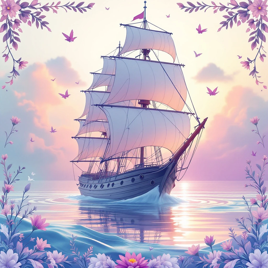An elegant and calming cover design for a self-care coloring book titled "Self-Care Coloring Book with Daily Reminders". The main title "Self-Care Coloring Book" is stylized in a serif font such as Playfair Display with a soft pastel color such as lavender or pink. The subtitle "with daily reminders" is written in a modern sans serif font like Raleway in a smaller size. The background features a gradient of soothing pastel colors, such as mint green transitioning to soft lavender. Subtle floral elements and a mandala adorn the edges, creating a relaxing and harmonious atmosphere. Photo of a ultra realistic sailing ship, dramatic light, pale sunrise, cinematic lighting, battered, low angle, trending on artstation, 4k, hyper realistic, focused, extreme details, unreal engine 5, cinematic, masterpiece, art by studio ghibli, intricate artwork by john william turner