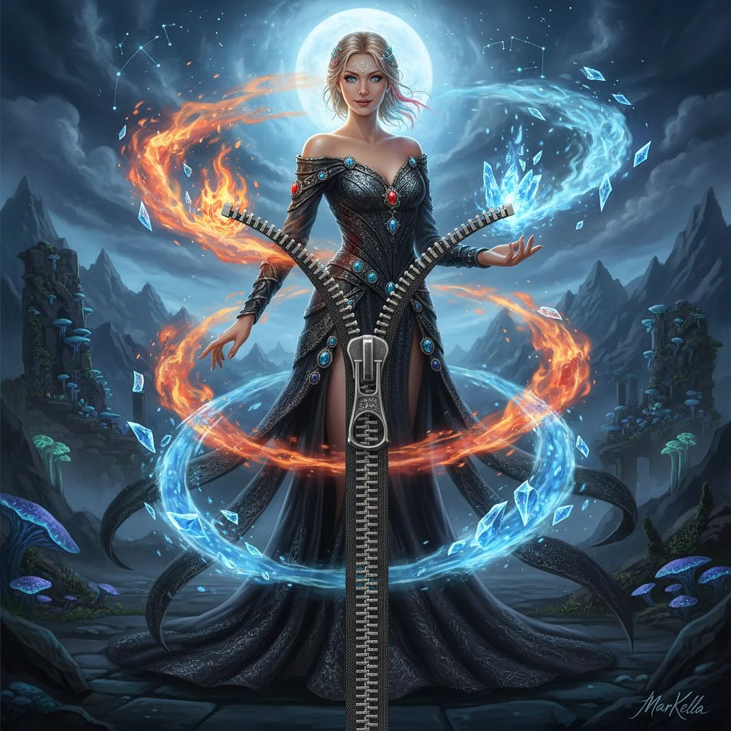 A stunning slim female wizard stands poised in a magical dark fantasy realm, casting a mesmerizing spell with elemental energies swirling around her. She wears an alluring off-shoulder costume adorned with elaborate rings, showcasing intricate details and textures. Her beautiful, fair skin glows under soft, ethereal lighting, emphasizing her enchanting blue eyes and captivating smile. Elements of fire, water, wind, and ice dance in a perfect dynamic composition, creating a breathtaking, ultra high-resolution masterpiece, with a large zipper going down the middle of the picture vertical. Signature MarKella