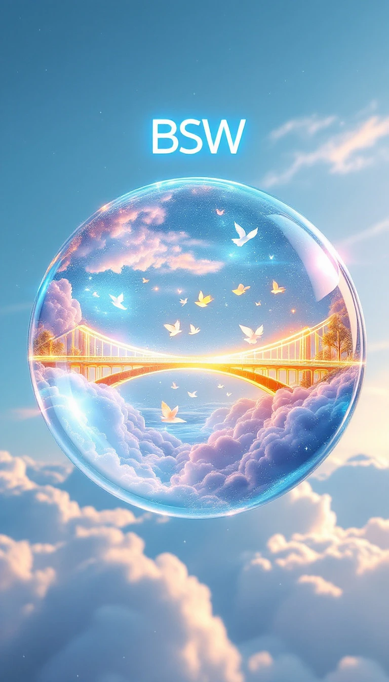 "A photorealistic glass sphere floating in a serene blue sky with soft, wispy white clouds. Inside the sphere, a powerful symbolic scene unfolds: a beautifully crafted bridge made of light stretches across the sphere, with one side showing a warm, welcoming gateway with simplified administrative papers floating in golden light, representing streamlined naturalization. The other side shows a clear boundary line made of soft blue light, symbolizing controlled migration. In the center of the bridge, humanitarian aid symbols emerge as gentle white doves carrying olive branches. The German flag colors subtly weave through the scene as ethereal ribbons. Above the sphere, the letters 'BSW' appear as a modern, translucent hologram in a clean, professional font glowing in cool blue. Below it, the word 'Immigration' floats as a smaller hologram in the same style. The entire image has a professional, diplomatic atmosphere with soft lighting and crystal-clear detail. The glass sphere reflects and refracts the sky, creating subtle rainbow effects. 8K resolution, photorealistic rendering, beautifully balanced lighting.