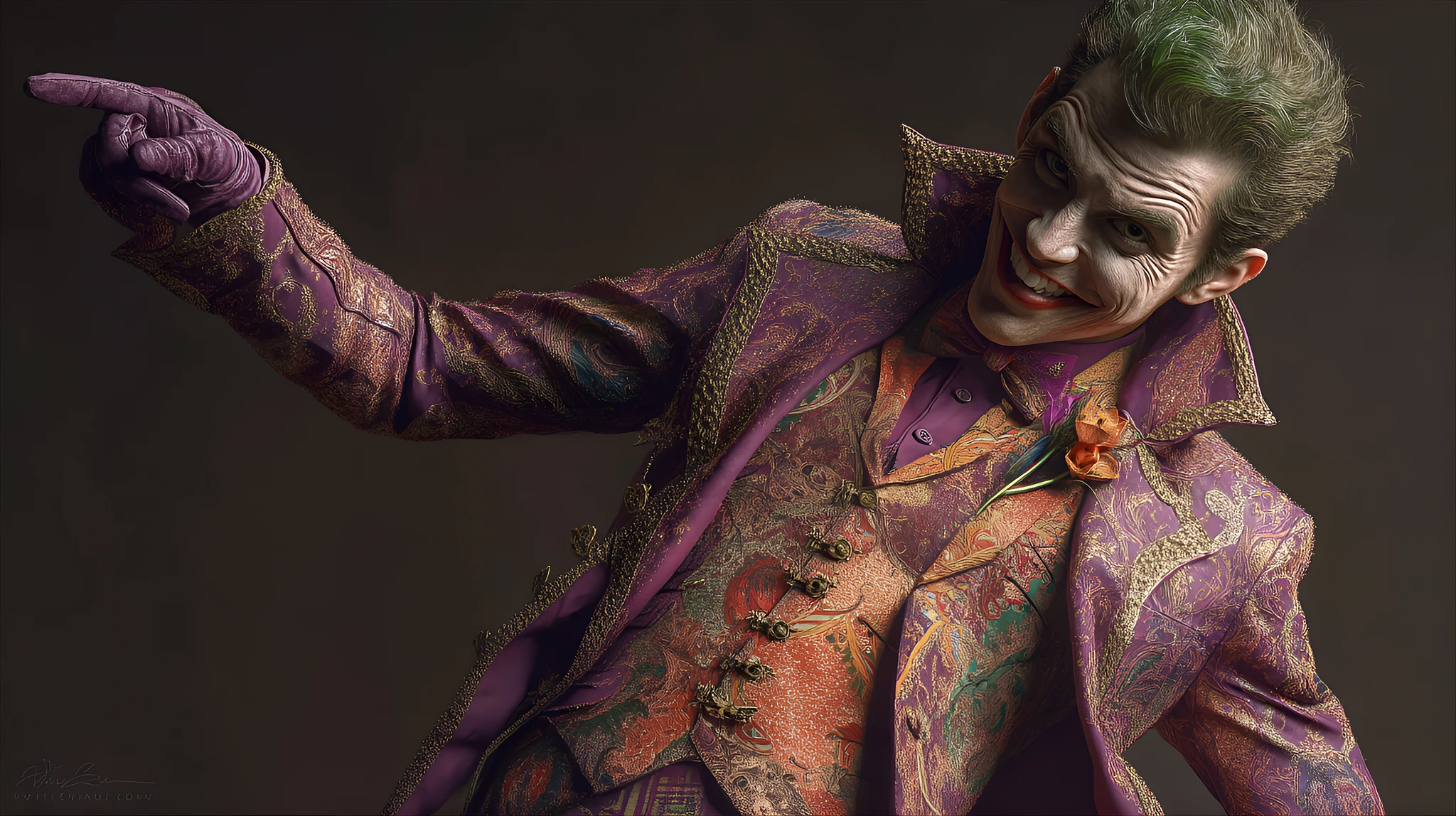 Caucasian male, approximately 25 years old, portrays the Joker, wearing a vibrant purple, ornate, military-style jacket with a gold trim and intricate paisley pattern. The jacket's fit is tailored and form-fitting. He sports a light reddish-orange, patterned collared shirt underneath the jacket, accented with a bright green and reddish-orange flower lapel pin, resembling a lily. He wears dark purple, detailed gloves. His expression is a wide, mischievous smile, his eyes are slightly slanted and manic, with white makeup covering his face. His hairstyle is a vibrant, short, green, slightly spiky, and neatly styled hair. He is posed in a three-quarter view, his right arm extended, with the index finger pointed outward, suggesting a theatrical or playful posture. Dark background, highly detailed, dramatic lighting focused on the subject. Sharp focus on the face and upper body. Photorealistic, digital painting style, comic book style