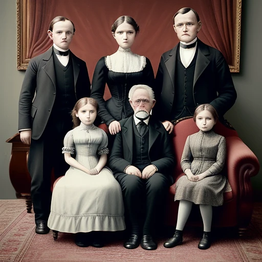 Family photo, Victorian era, grandfather and grandmother are sitting on the sofa in front, the youngest daughter, 12 years old, and the middle daughter, 22 years old, is sitting next to them, the father and mother are standing behind, full, the eldest daughter is standing in the middle, all in suits and dresses