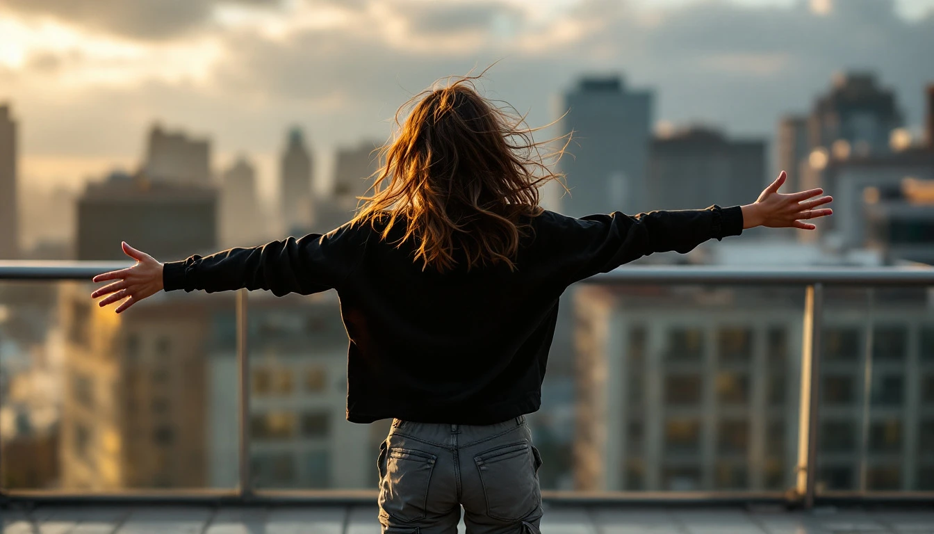 photograph of a woman expressing freedom, rear view, full body, building rooftop at safety railing, dressed in street style, black shirt, cargo jogger pants and red high-top Nike dunk high with rich detailing, utilizing a sony a7r iii with a 50mm prime lens set to f/2, 2 for a shallow depth of field, image captures at 1/1000 sec exposure, emphasizing her figure against morning mist over city, detailed shot showcases every fabric fold and casual grace of urban life, dramatic sunlight with clouds, photorealistic, UHD, detailing --ar 9:16 --style raw --stylize 50 --v 6. 1