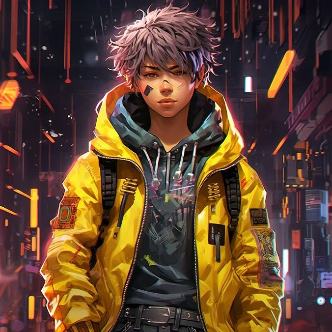 Enter the mesmerizing world of "Neo Reverie," where a teenage boy with a charismatic presence stands before you. His yellow and black jacket exudes an edgy style, perfectly complementing his fashionable hair that captures attention with its unique flair.