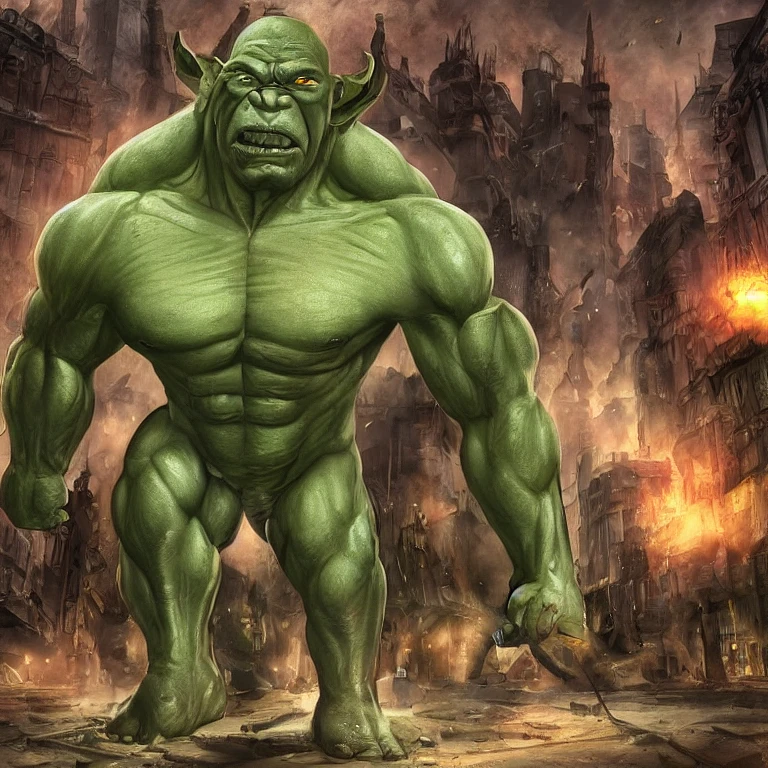photo of an enormous muscular orc bigger than normal people with green skin flexing his huge pecs and biceps with huge veins on muscles on ruined city, people around being shocked, extreme quality, light on muscles, 4k quality,