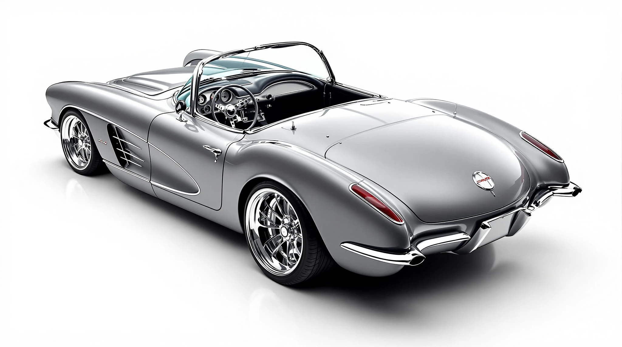 Hyper realistic 1959 chevy corvette convertible, rear side top view, gray color, restomod with no chrome, with 20" deep dish wheels, lowered car, white backround.