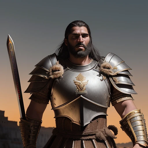 Gladiator Maximus Desimo Meridio, commander of the armies of northern Rome, very detailed and super realistic with his war armor spectacularly outlined against the extensive battle in Rome in the year 180 AD, at night, holding tightly to a sword Roman, imposing, with a powerful hand, luminous glow over the landscape. Use a Canon EOS R5 with a Canon RF 24-70mm f/2. 8L lens, set ISO to 200, use an aperture of f/2. 8, set the shutter speed to 15 seconds, the white balance to auto, use a Manfrotto MT055CXPRO4 tripod and a Canon BR-E1 remote shutter release, and experiment with low-angle shots and framing to highlight the gladiator silhouette against the bright lights of ancient rome.