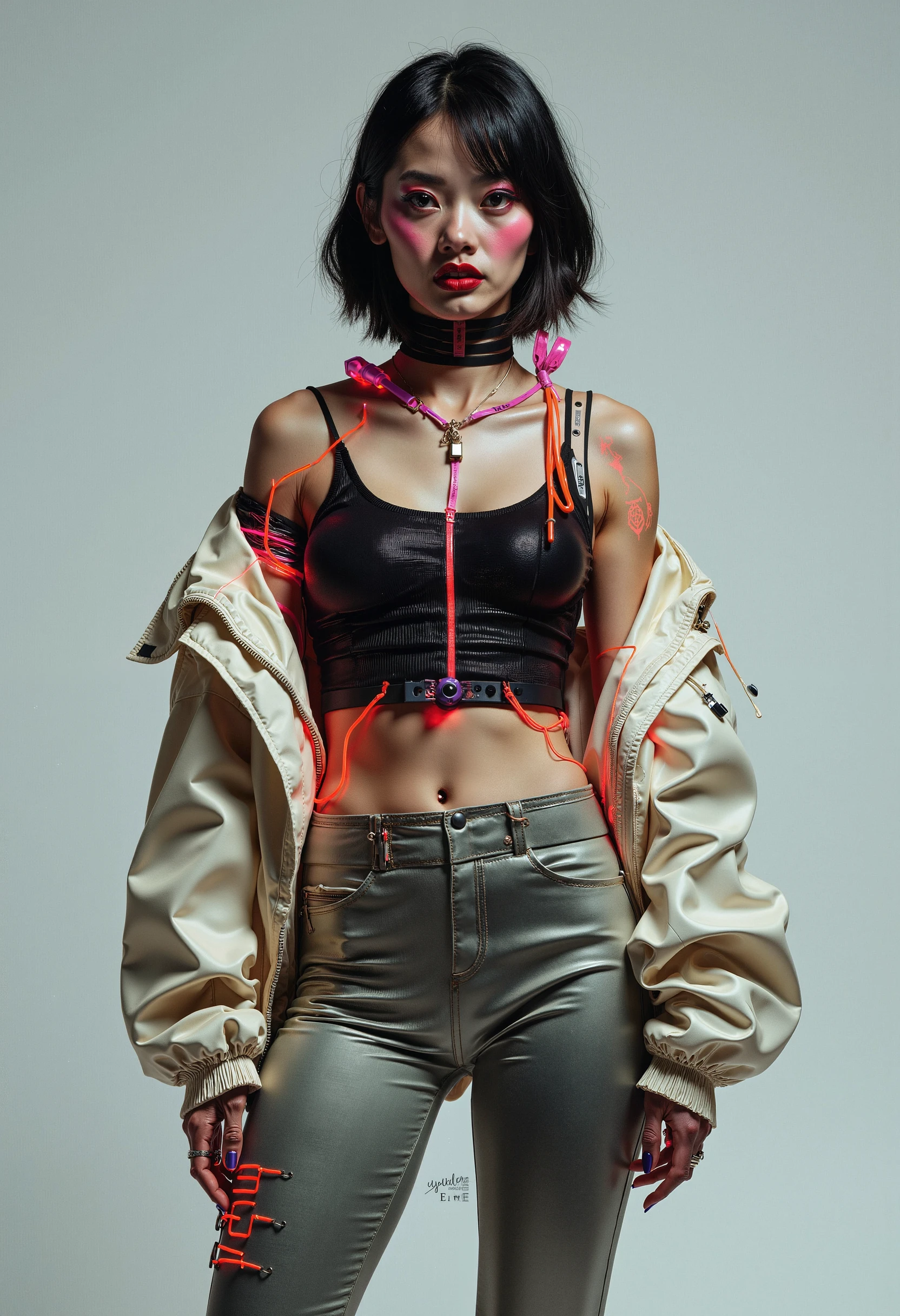 Fmelancholic and slightly depressed expression, yet her beauty and confidence are undeniable. Her outfit reflects the style of a high-fashion enthusiast, blending futuristic materials like metallics and neon accents with retro elements like oversized jackets, geometric patterns, or cyberpunk-inspired details. She has a fit and well-proportioned physique. Her hair is short, straight, and cut just above the shoulders, with a sleek and modern style. The background is a plain gray, allowing her unique style and aura to stand out. Add subtle lighting to emphasize her features and outfit without overwhelming the scene.