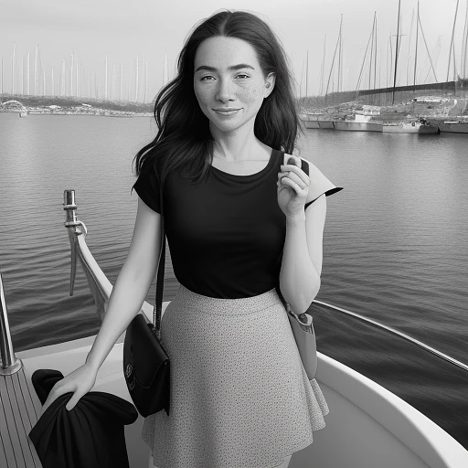 12K, HRD, film grain, 100 ASA, freckles. The image features a beautiful freckles woman standing on a boat, wearing a black skirt and a grey shirt. She is holding a purse in her hand, and her outfit appears to be stylish and elegant. The woman is posing for a picture, likely enjoying her time on the boat and the surrounding scenery. The boat itself is a prominent element in the image, with the woman standing on the deck, showcasing her confidence and poise. (controlnet_mode:canny realmixXL, sdxl-1.0.0.9.safetensors, SeargeSDXL4.2-Llama2 prompt)