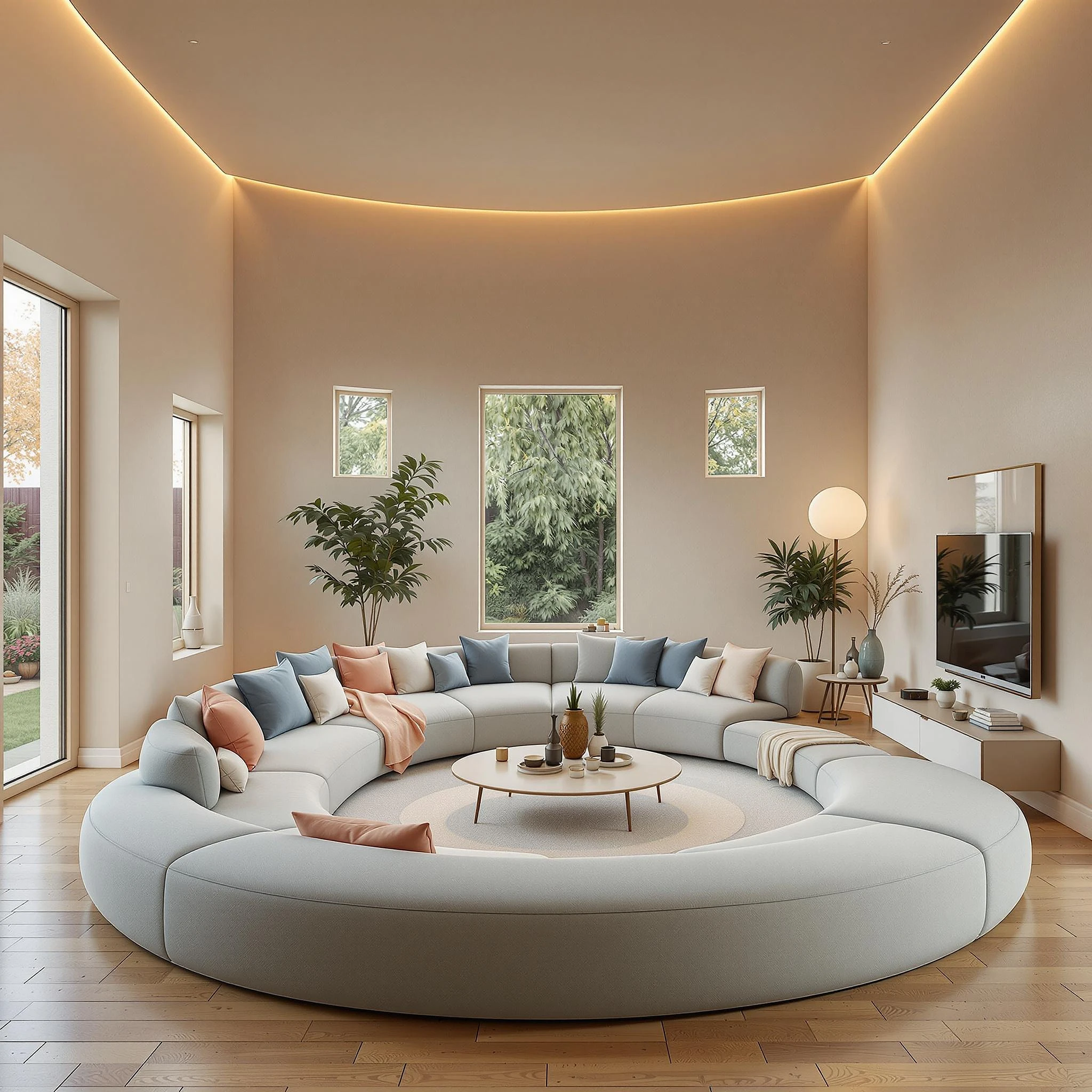 High resolution photography interior design, dreamy sunken living room conversation pit, wooden floor, small windows opening onto the garden, bauhaus furniture and decoration, high ceiling, beige blue salmon pastel palette, interior design magazine, cozy atmosphere; 8k, intricate detail, photorealistic, realistic light, wide angle, kinkfolk photography, A+D architecture