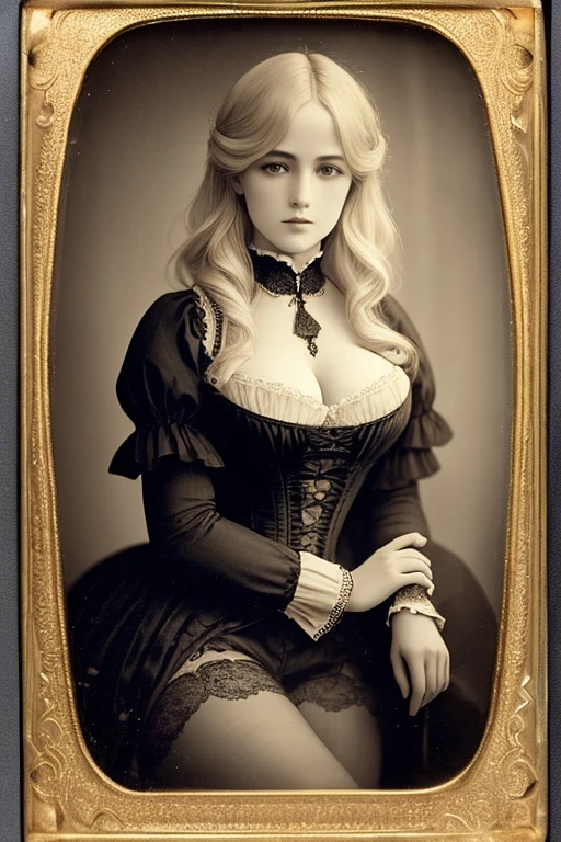 blonde hair, detailed and intricate daguerreotype photograph| gorgeous victorian girl in lingerie | hair flowing down| thick thighs| look at viewer| symmetry| elegant| art nouveau