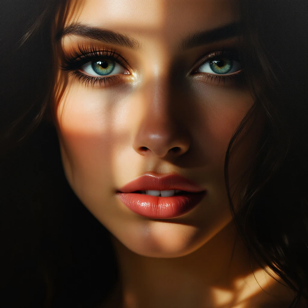 A **breathtaking, ultra-high-definition (UHD) photorealistic digital oil painting on canvas**, capturing a **stunningly beautiful woman** with a **perfectly symmetrical face**. The **chiaroscuro lighting enhances the contrast** between **light and shadow**, giving the painting a **timeless, dramatic elegance**.