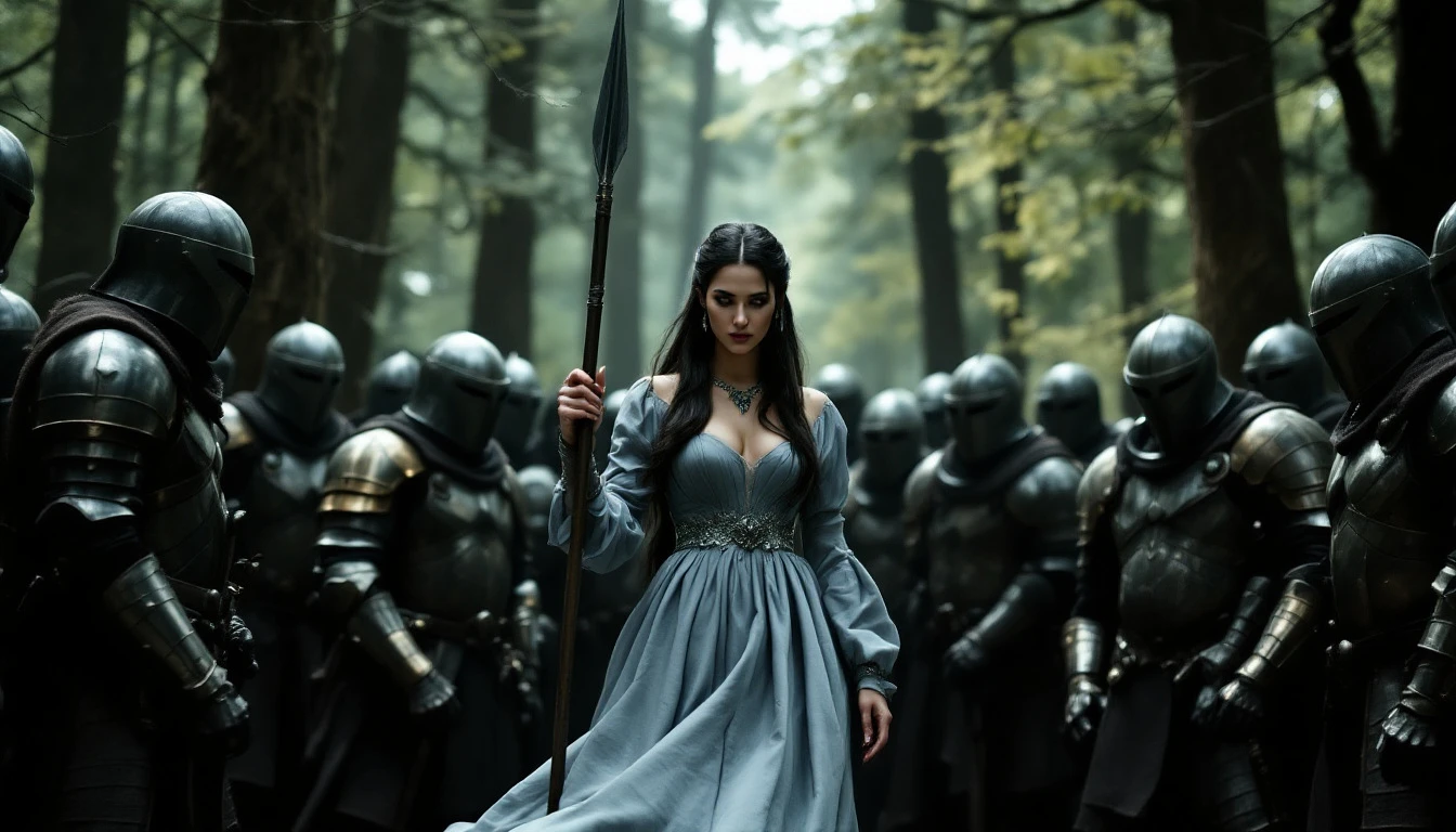 a woman in a gray dress standing in a forest surrounded by armored soldiers. The woman has long dark hair that is pulled back from her face, and she is wearing a gray dress with a full skirt and a bodice that is adorned with a necklace. She is holding a long spear in her right hand, and her left hand is resting on the shoulder of one of the soldiers. The soldiers are all wearing armor and helmets, and they are standing in a semi-circle around the woman. They are all looking at her, and some of them have their hands on the hilts of their swords. The background of the image is a forest, with tall trees and branches visible behind the woman and the soldiers. The lighting in the image is dim, with the only light coming from a few rays of sunlight that are filtering through the trees.
