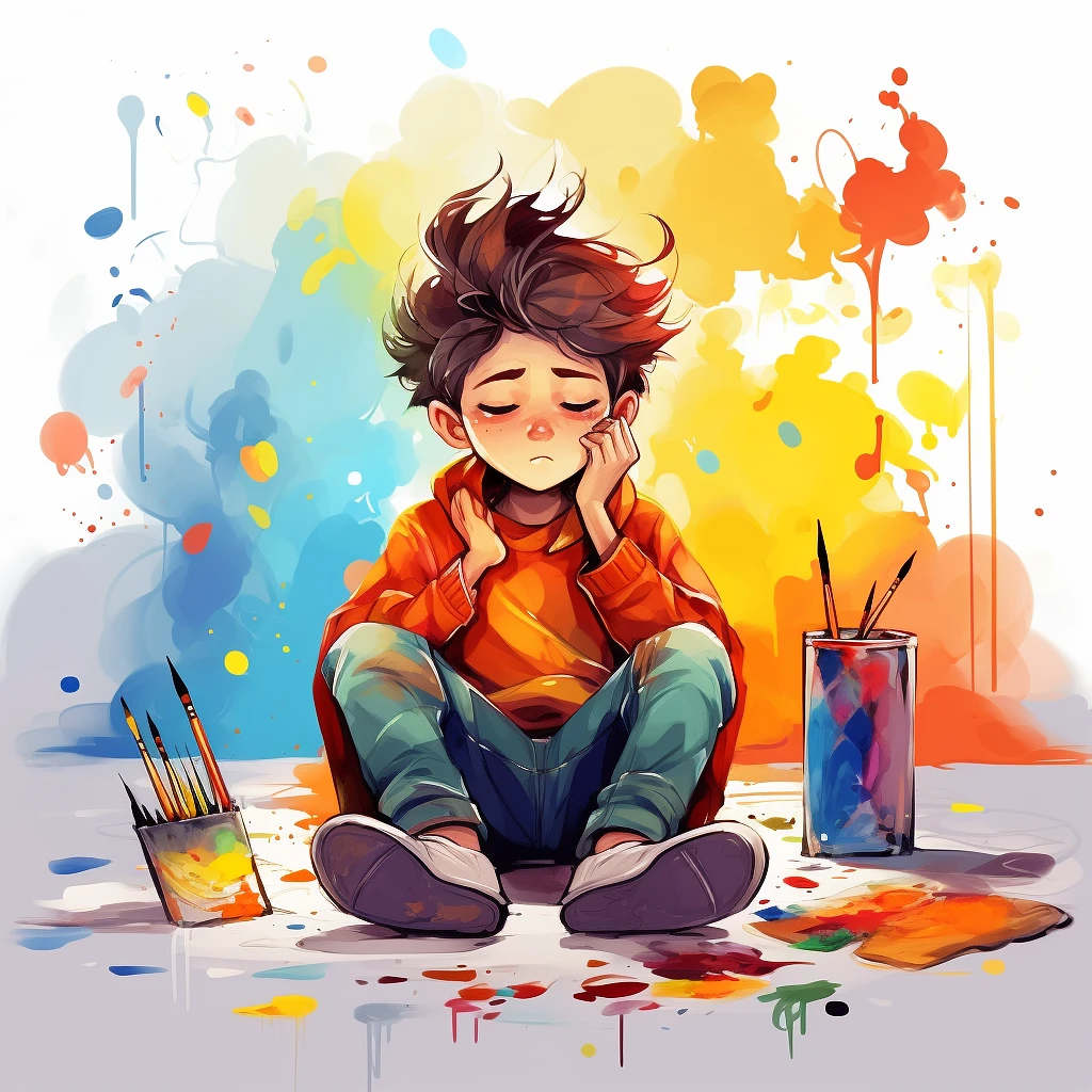 UI Cartoonish illustration, a boy painting, creativity, Pop Art watercolor, vibrant color palette, Sad Colors background --v 5. 2 --style raw