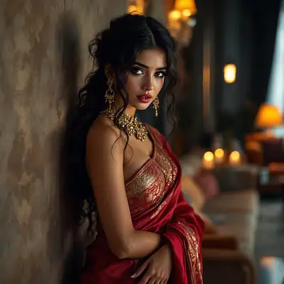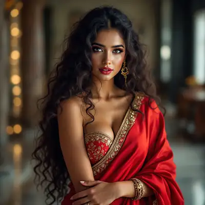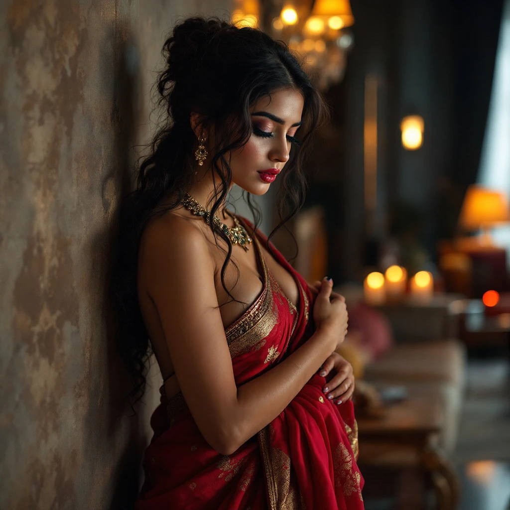 full body view of most beautiful european girl as most beautiful indian girl, most beautiful girl in elegant bold color saree and long curly hairs, hairs tied up with hair style stylishly, necklace, big wide black eyes, full face, 34b 28 34 figure, makeup, low cut neck, SLEEVLESS, LOW CUT BACK, girl embracing with emotion and possessive feeling, standing support with a wall, bitting her lips, modern elite photo room, with luxury sofa set, most beautiful girl in elegant bold color saree and long curly hairs, hairs tied up with hair style stylishly, necklace, big wide black eyes, full face, makeup, low cut neck, SLEEVLESS, DEEP CUT NECK AND BACK, girl embracing with emotion and possessive feeling, emotional crying with longing feeling, innocence and ecstasy, background, spacious modern elite photo room, with luxury sofa set, MAROON color carpet, elegant interior designs, vintage lamps, romantic reunion ambience, photorealistic, vibrant colors, intricate details, 8k. et, elegant interior designs, vintage lamps, romantic reunion ambience, photorealistic, vibrant colors, intricate details, 8k.