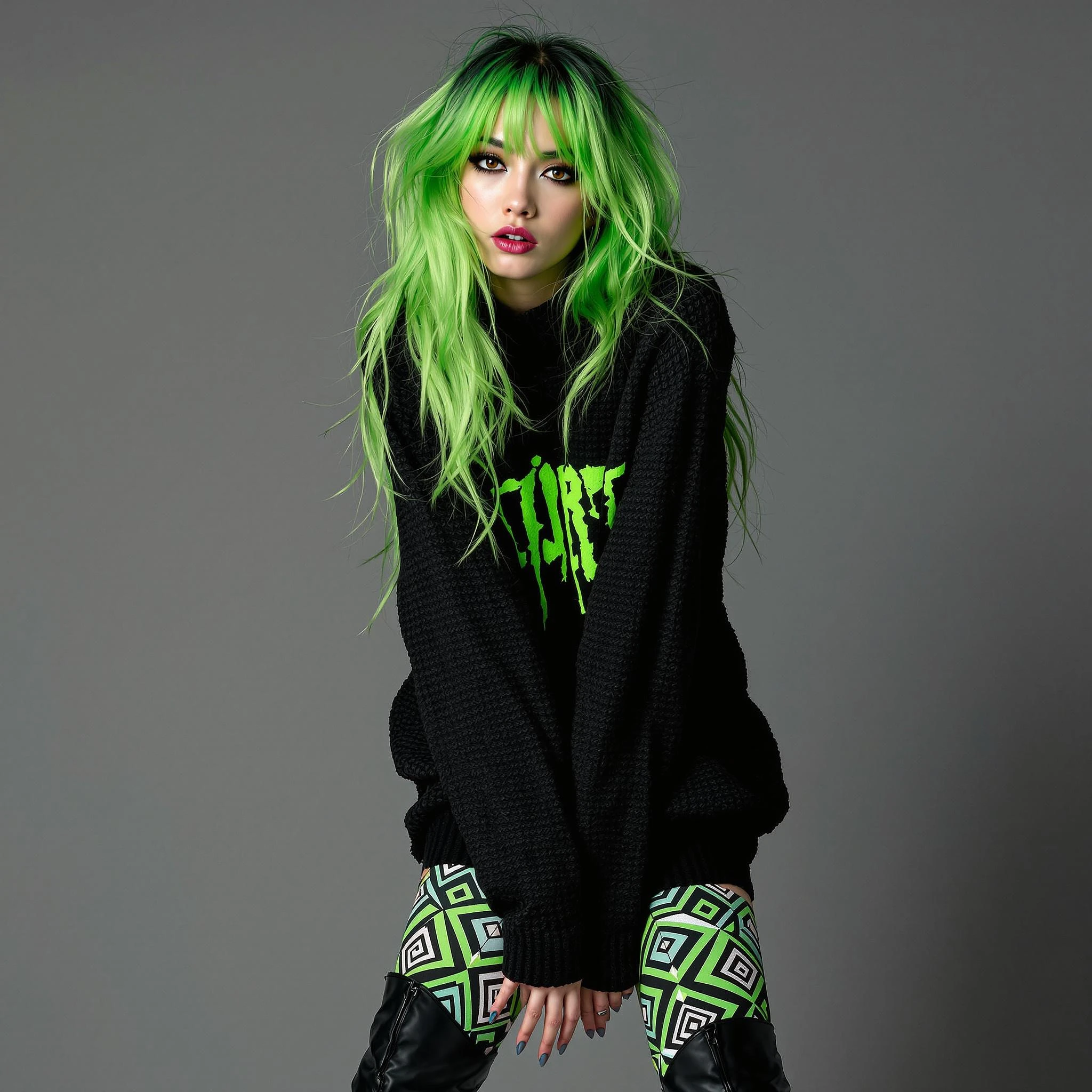 A professional SLR photograph of a fashion scene featuring Miyuki, a 20-year-old Japanese woman with long, slightly tousled green hair that shows dark roots, deep intense eyes accented with dark eyeliner, pale skin with a subtle glow, and a fuller bust. She leans slightly towards the camera, her playful confidence radiating through her intense gaze. Her rich green hair catches the soft glow of diffused studio lights, blending perfectly with her knitted oversized sweater--a bold mix of deep black with neon green accents. She pairs it with thigh-high stockings featuring vivid geometric patterns in shades of green and black, complementing her sleek black platform boots. Her pose is dynamic, her figure angled slightly to emphasize her flowing hair and layered textures. The background is a minimalist gray gradient, throwing all focus onto Miyuki's striking individuality and bold style.