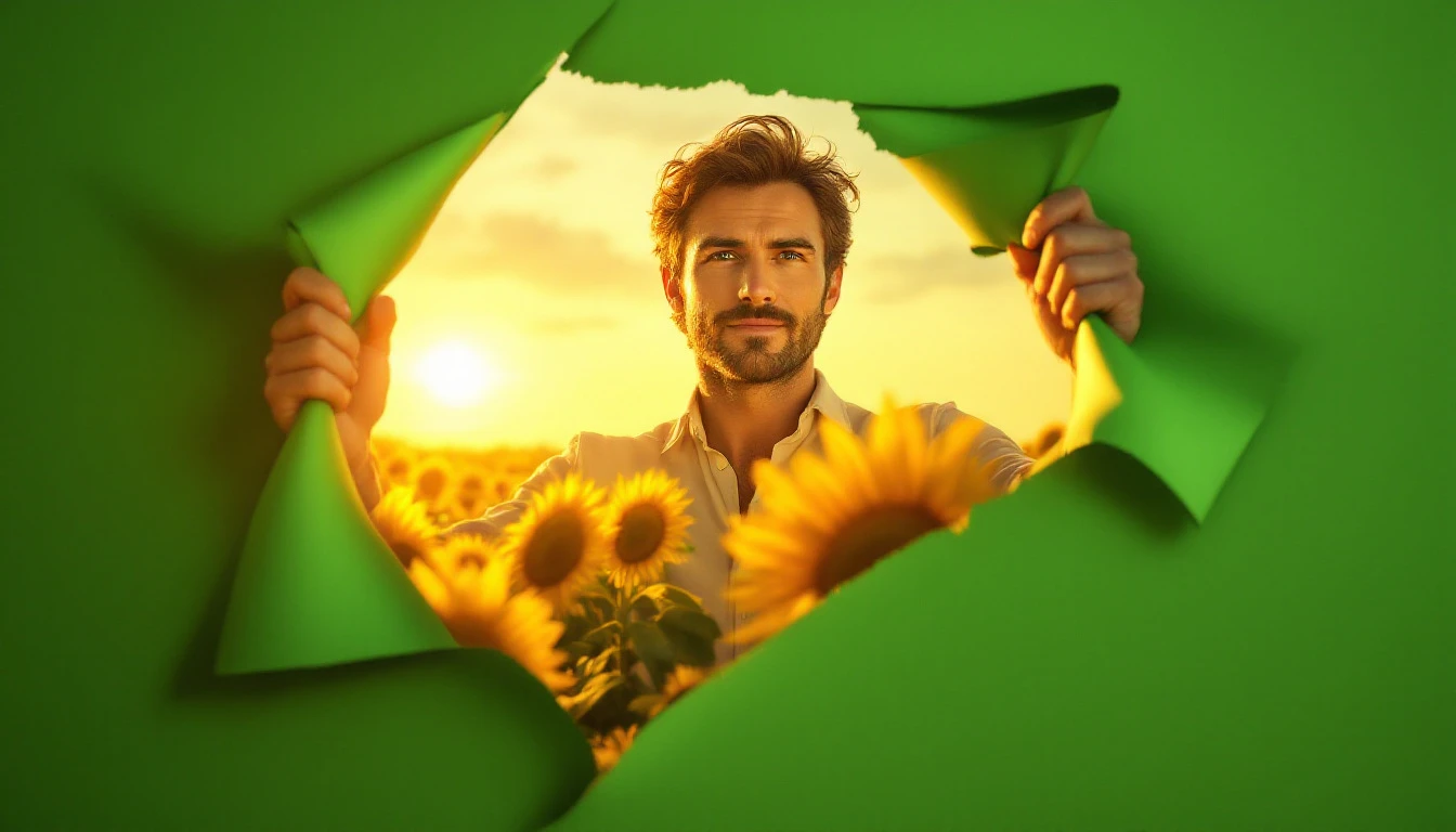 A photo of a European man with a confident expression tearing a green paper wall. He reveals a tropical sunflower field at sunset. The lighting is warm and golden. The composition is symmetrical, reminiscent of Wes Anderson's style.