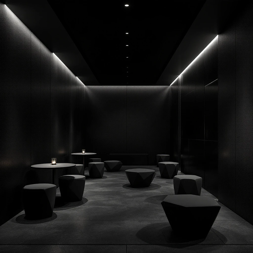 visualize a sleek lounge area with dark, textured walls and recessed linear lighting, furniture consists of modern, geometrically shaped stools and tables, all in dark shades that complement the soft ambient lighting, atmosphere is intimate and modern, with a focus on clean lines and minimalistic design, UHD resolution --ar 16:9