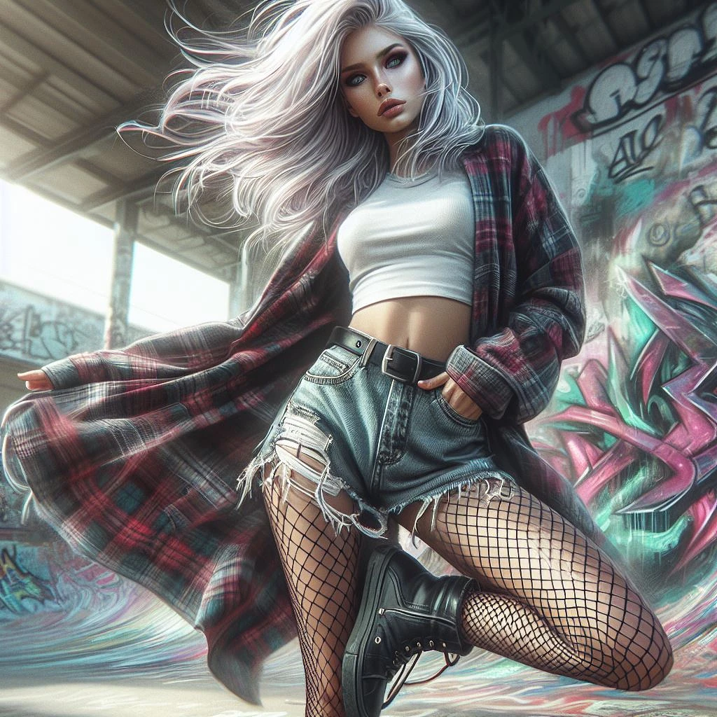 painterly style, , Slim and svelte gothic woman with a slender waist and hips, posing with hands in pockets for a casual stance, messy hair, long white hair flying in the air, wind blowing, thin, pretty eyes, Oversized flannel shirt, ripped fishnet stockings, combat boots. Graffiti-covered urban skate parks . dynamic angle, intricate details, multicolor explosion, blur effect, sharp focus, uhd, colorful shot, modifier=CarnageStyle, color=blood_red, intensity=1. 6, add lace