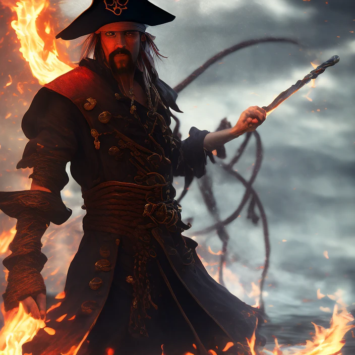 close up shot photography of a fire pirate mage against a water manifestation, heroic fantasy, realistic yet stylized, raging elementals backless dress, dark fantasy pirate, dynamic focus, dynamic posture, beautiful volumetric light, in - action shot, ultra high quality, cinematic fantasy art, cinematic shot --s 850 --ar 6:9 --c 15 --v 5. 1