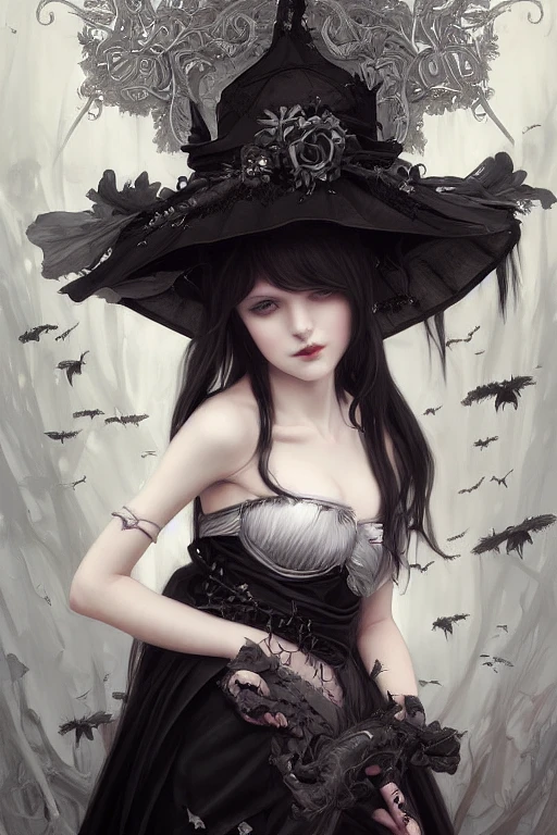portrait of radical lolita girl, dreamy and ethereal and dark, dark eyes, silver hair, smiling expression, ornate goth dress, dark fantasy, chaotic, elegant, black crows flying, highly detailed, digital painting, artstation, concept art, smooth, sharp focus, illustration, art by artgerm and greg rutkowski and alphonse mucha