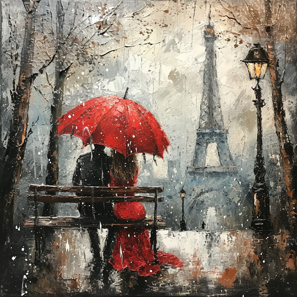 This is a romantic and evocative painting capturing a couple sharing an umbrella during a rain shower with the Eiffel Tower in the background, emphasizing the setting in Paris. The painting depicts two people sitting close together on a bench, sharing a large red umbrella. They are surrounded by rain, creating an atmosphere of intimacy and coziness amidst the downpour. The person on the left is wearing a bright red dress that matches the color of the umbrella, while the one on the right is in darker attire. In the background, blurred by rain, stands the iconic Eiffel Tower along with street lamps illuminating their surroundings. The brush strokes are visible and add texture to represent raindrops and wet surfaces around them. The overall mood of this artwork is romantic and intimate. Oil painting. No photography . Pre-Raphaelite style, broad brush strokes