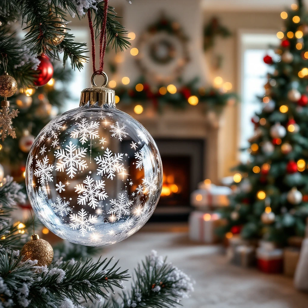 crystal ornament with beautiful snowflakes . The shelf is filled with many Christmas ornaments. In the background, there is a warm and cozy room with a fireplace and a Christmas tree.
